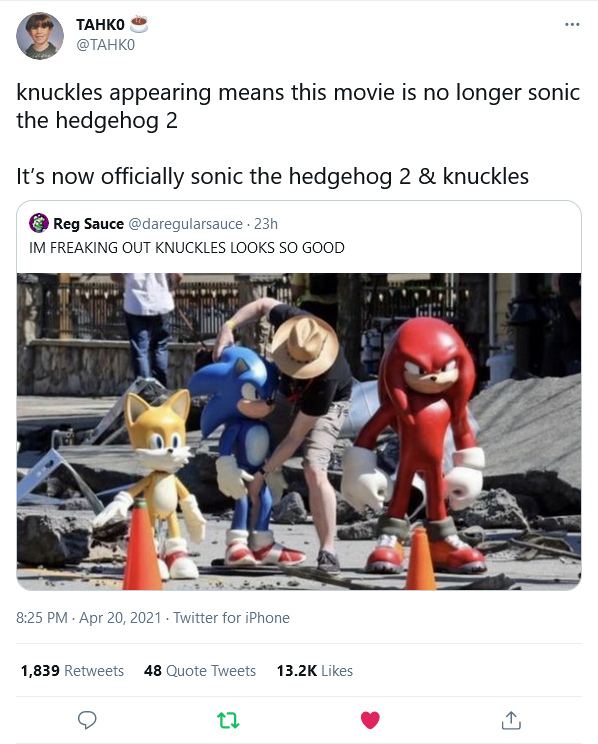 When you’re filming on location, it can be difficult to keep certain aspects of your film a secret. Fortunately for Jeff Fowler and the folks at Paramount working on the Sonic the Hedgehog 2 movie in Fort Langley, BC, the biggest surprise to escape their set and explode across Twitter is also one of the most obvious.