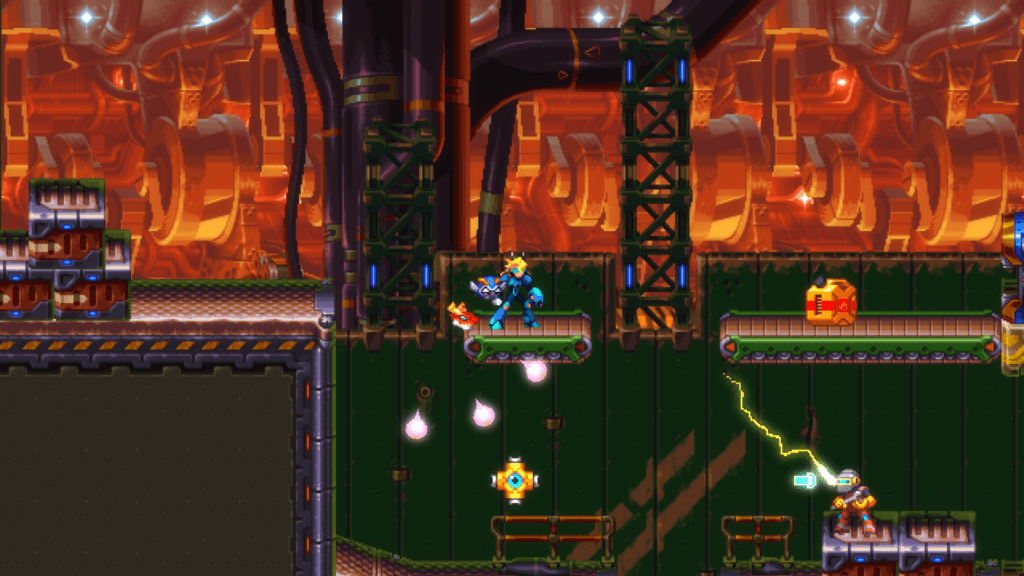 The seventh level of the game, Dustria brings a dangerous industrial setting to 30XX.
