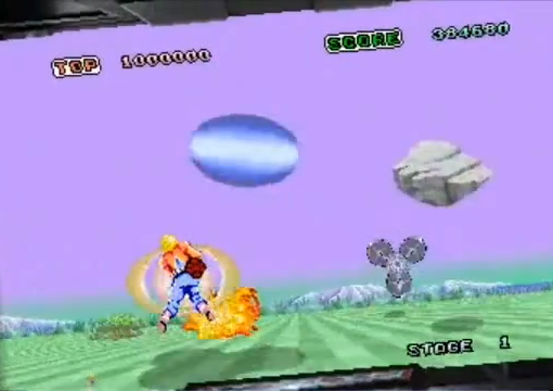Again I was wrong. Seriously the 3D effects have really added some proper depth to the game. Because Space Harrier is a 2D game, giving the illusion that you are flying/running endlessly forward across various terrains, the game needed to use varying pixel sizes for its enemies – so when in the distance are small, getting bigger.