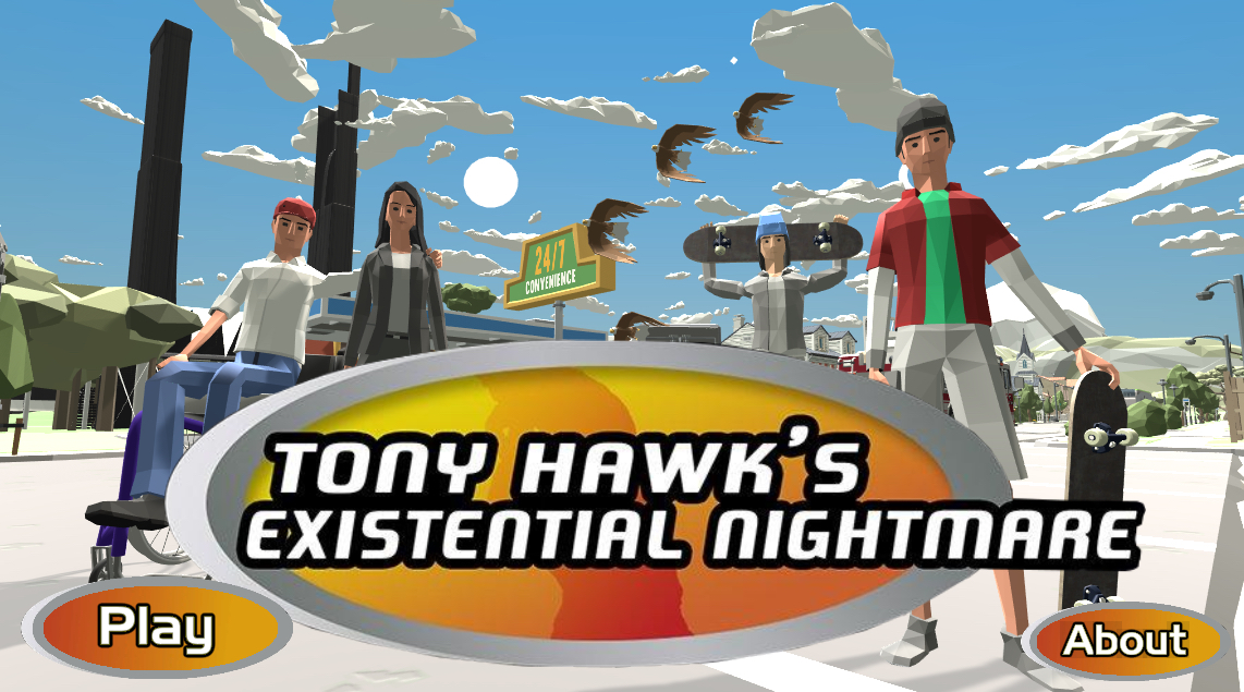 Tony Hawk’s Existential Nightmare is an amazing game simply because it exists. Gamers play as Tony Hawk, sort of, as he boards and skates around his neighborhood and does his best to nails tricks, more or less.