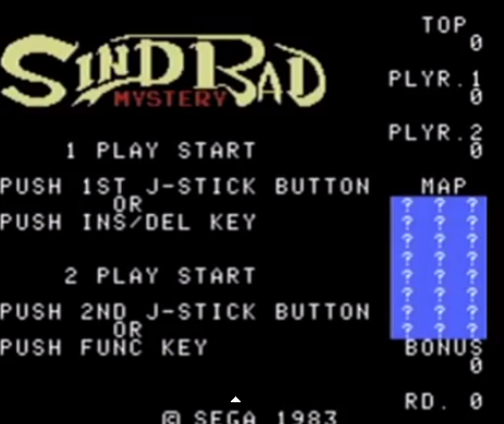 Sindbad Mystery was developed by SEGA in 1983 for the arcades. It is notable for being the last game developed for the less-than-notable G80 arcade architecture. The G80 architecture is often considered the successor of the VIC Dual architecture. Much like the Mega Drive is similar to the System-16 architecture and the Dreamcast is similar to the Naomi architecture, the SG-1000 is similar to the VIC Dual. The original three games; Borderline, Safari Hunting, and N-Sub were almost perfect ports from the VIC Dual. The G80 is much more powerful, which makes the port of Sindbad Mystery very poor in comparison. Sindbad Mystery game was ported one more time to the SEGA Saturn, which was arcade perfect for all intents and purposes.