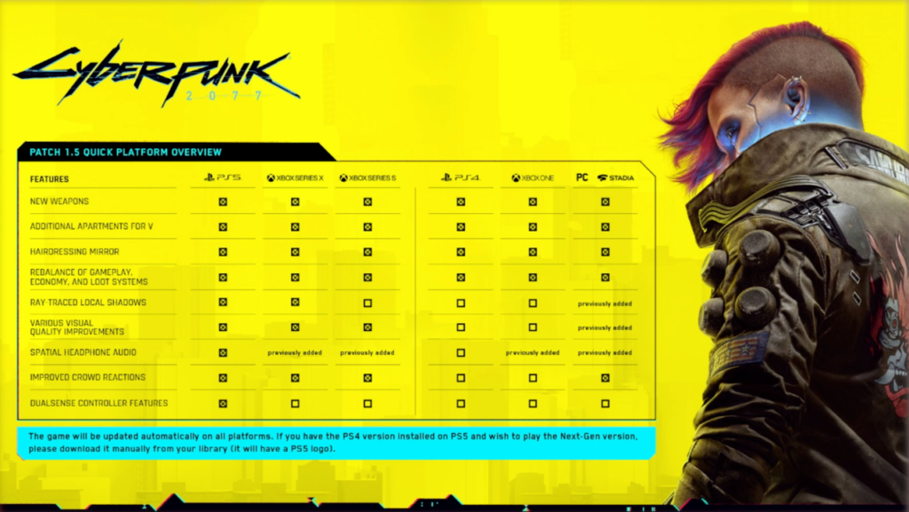The game is coming to the PlayStation 5 and Xbox Series X/S later this year alongside the 1.5 patch. CD Projekt Red is modifying the gameplay with new weapons, new apartments, and a rebalanced economy and skill tree. The patch also includes a number of visual enhancements, including ray tracing and 4K resolution support.