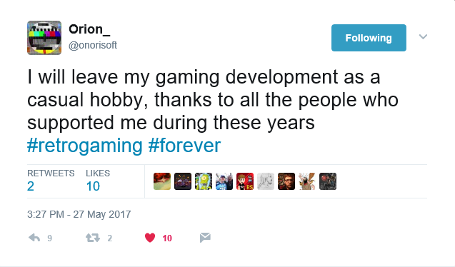 “I will leave my gaming development as a casual hobby, thanks to all the people who supported me during these years #retrogaming #forever“