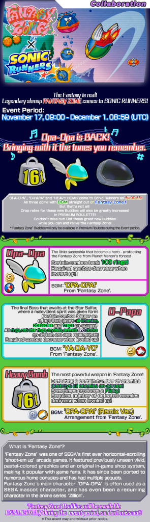 The glorious day in which 2 different timeline favorite SEGA mascots collab on a platform game has arrived, at least in the mobile space (besides other genres such a racing in the SASRT series or the RPG space at Segagaga). Opa Opa, his father O-Papa, and the 16 Ton weight have arrived from today, Novemeber 17th 2015, to SEGA’s mobile hit title Sonic Runners! Grab your phone or iOS and Android device and start unlocking this awesome collab to be remembered for the SEGA AGES!