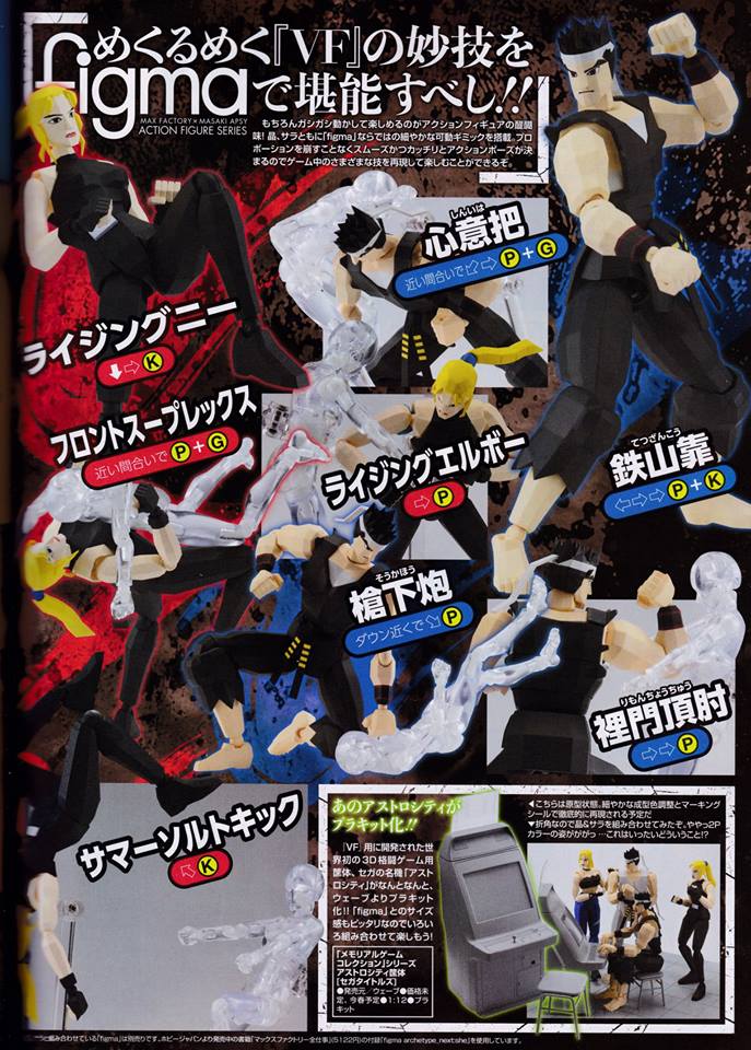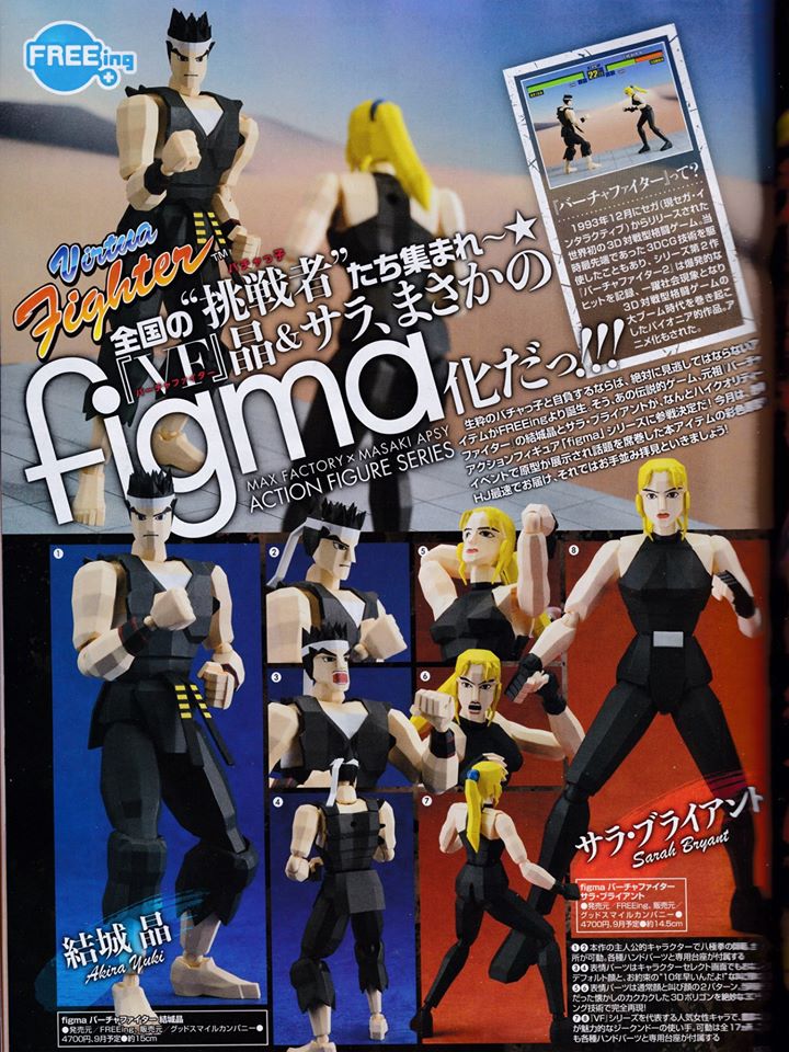 Figure Oh! Magazine has revealed in its latest printed edition more information and details for the upcoming Virtua Fighter Figmas by FREEing and Max Factory. The figures will be released on September this year (2016) for 4700 Yen (plus tax), with Akira Yuki and Sarah Bryant on their black costumes being both releases. The magazine showcases alternate costumes for the figures, but it is still unknown if these will be out too. Wave will be releasing an Astro City model kit compatible with the Figma’s scale too. It is highly possible for these finished versions to be showcased at Winter Wonfes 2016 next month. Are you excited for these figures too? Let us know in the comments!