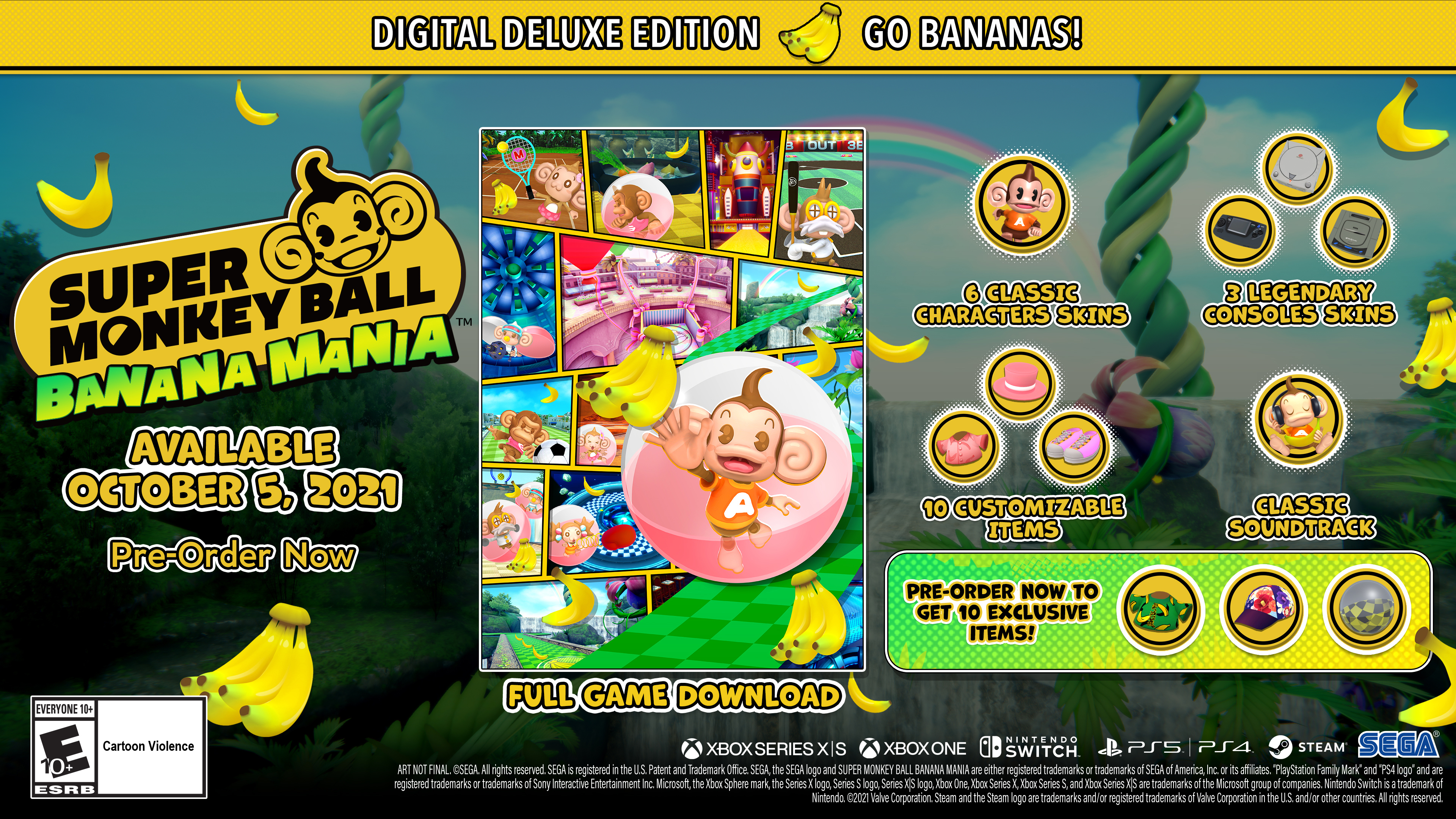 Super Monkey Ball: Banana Mania is developed by Ryu Ga Gotoku Studio and will be released on the PlayStation 4, PlayStation 5, Xbox One, Xbox Series X/S, Nintendo Switch, and Steam. The game will launch on Oct. 5, 2021. Retail prices are $29.99 USD for standard editions and $39.99 USD for deluxe versions.