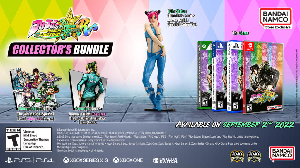 In addition, there will be three editions of the game, with the Standard Digital edition going for $49.99 USD. The Digital Deluxe edition ($69.99 USD) contains the game along with a special animation color set, exclusive costumes for Mohammad Avdol and Rohan Kishibe, and the game’s Season Pass. The Collector’s edition ($69.99 USD; pictured below) includes the game, the animation set, a unique costume for Jolyne, and an alternate color 10 in. figure for Jolyne by Grandista.