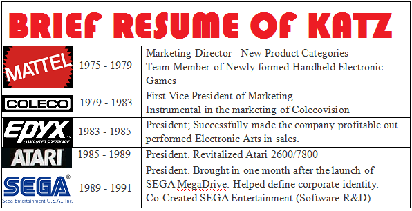 From what I gather, Katz was more of a managing director than a president. He was a hardworking stiff; an employee. He worked under Rosen (vice chairman) and with Shinobu Toyoda – those two were the executives where as he didn’t really entertain the extreme vision of Chairman Nakayama to sell a million Genesis units or yell “Hayakumandai” (“million” in Japanese) every morning in an assembly.