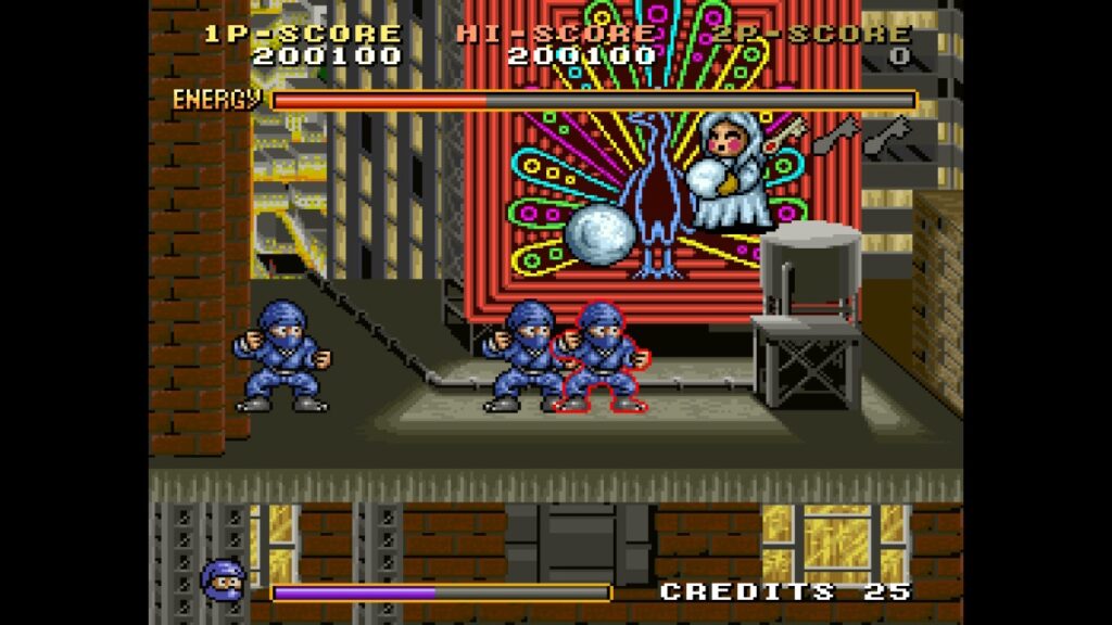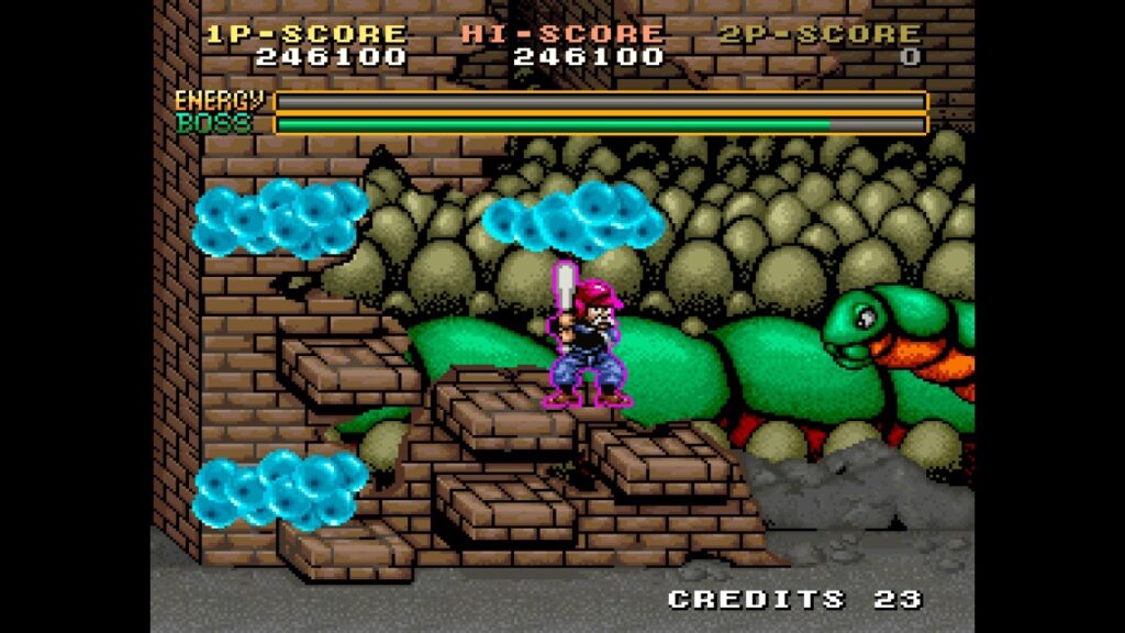 At the end of each level a boss, your standard arcade quarter eating, damage sponge, must be dealt with. Some are inventive like a blob of ooze that crawls ceiling to floor, or a crane that opens its door protector while lowering its shovel at you. All of them I dispatched with relative ease.