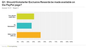 The poll results are posted below. 4,670 of the respondents answered, “Yes, please make the Kickstarter Exclusive Rewards available on PayPal.” 4,009 respondents answered, “No, Kickstarter Exclusive Rewards are for Kickstarter only.” And 6,432 answered, “Either is fine with me.”