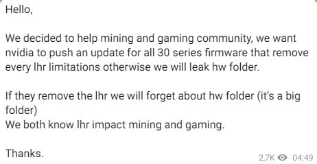 And this is where things get weird. In another statement, Lapsus$ claims it is doing this to help out gamers and the mining community, by demanding Nvidia remove the lite hast rate (LHR) limitations in all GeForce 30 series firmware. The LHR limitation, the GPU’s mining capacity for cryptocurrency, and by extension NFTs, was put in place in May 2021. The hope was to discourage miners from using Nvidia products to mine. It was noted in January 2022, the limitation had failed for the most part.