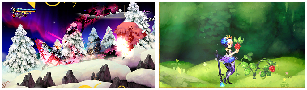 The graphics are fairly wonderful, with incredible animation, rich colors, and decadent lighting. World-building is taken to another level, as in many of Vanillaware’s games, which leaves the player feeling fully submerged in a kind of lucid dreamscape. Sprites are fluidly animated, and resolution is crisp and clean. Whether showcasing a stage full of falling snowflakes and happy snowmen, or a lush and verdant coniferous hillside, Odin Sphere’s art designers have nailed the aesthetic. Whatever the environment, things look gorgeous.
