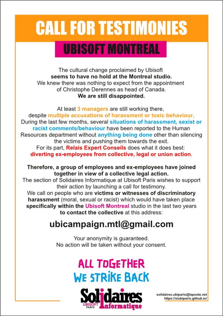 Activision isn’t the only one in hot water. On July 13, Ubisoft Paris put out a call seeking testimonies from their employees in the matter of allegations leveled at Ubisoft Montreal. “We call on people who are victims or witness of discriminatory harassment (moral, sexual or racist) which would have taken place specifically within the Ubisoft Montreal studio in the last two years to contact [Relais Expert Conseils],” the studio said in a flyer that has now gone viral.