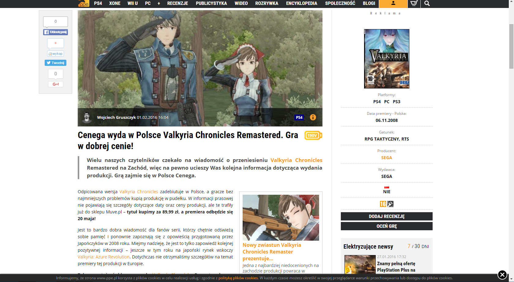 Polish site reporting a release date for Valkyria Chronicles remaster on PS4