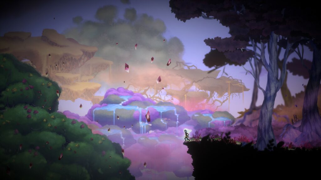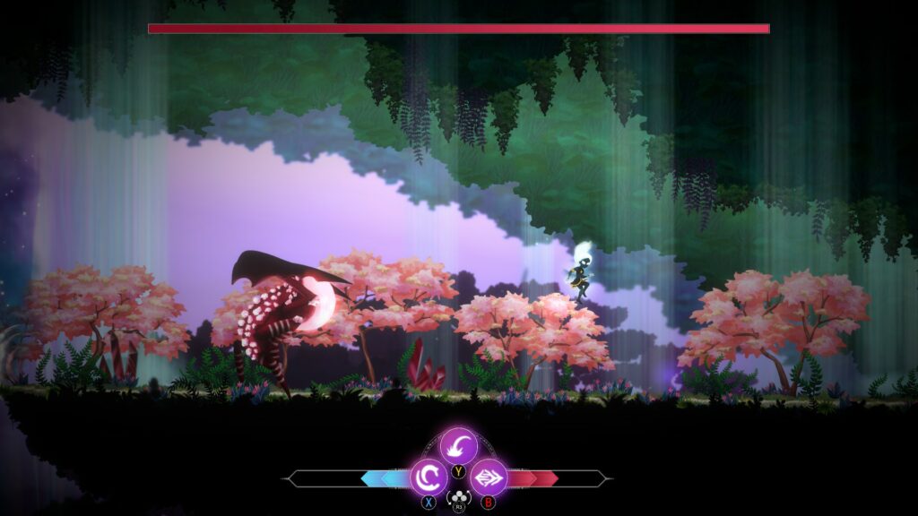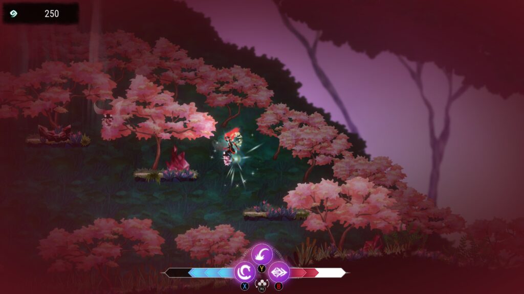 RIN: The Lost Child is a platformer at heart, with exploration being at the forefront of the gameplay. You’ll traverse multiple biomes through the game, each having vastly different enemies and hazards to encounter. As you explore, there will be different obstacles in the way, and may require different approaches to overcome them. This, however, leads into one of the issues of the game. The platforming is very precise, requiring you to risk health or death if you don’t make the jump perfectly. This is an issue because everything blends together. The art-style, while beautiful and well designed, is heavily cluttered and makes discerning things difficult.