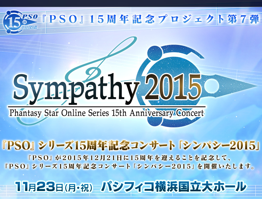 SEGA Japan will be celebrating PSO’s 15th Anniversary with a concert titled “Symapathy 2015” on November 23rd 2015 at the Pacifico Yokohama National University Hall (Yokohama City, Kanagawa Prefecture, Japan). The event will feature 3 parts, an orchestral one with Masamichi Amano as director with the sympathy Special Orchestra in charge of the musical part; a live vocal song concert with Annette Marie Cotrill, Haruko Momoi, Atsuko Enomoto, Kai Ichitaro, Aoi Shota, Emi Nitta, Satomi Sato, silicic Mari Takano, Rico Ohara, Takagi TomoRika, and SEGA long time veteran fan favorite: Takenobu Mitsuyoshi; and a closing part with a talk that includes Phantasy Star and PSO series creator Yuji Naka, veteran producer Mikichi Takao, and the series current producer Satoshi Sakai.