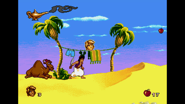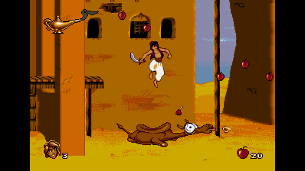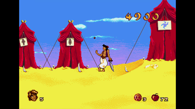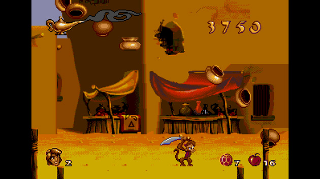 For example, changing direction you see Aladdin’s face move and look around. His arms flail about when you jump off heights and he looks to the ground, as though seeing where he’s going to land. And should you need to put down your controller, but forget to pause the game, you see Aladdin look around a bit and then throw an apple around, rolling it off his arm and flipping it up, much like in the movie.