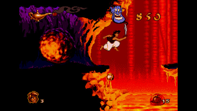 Unlike so many other platform games at the time, which might have you just running left to right, Aladdin’s levels vary in direction and gameplay. While you work your way up and across the street of Agrabah in the first level, you later find yourself escaping from molten lava on the back of the Magic Carpet in a very fast-paced and exciting ride out of the Cave of Wonders.