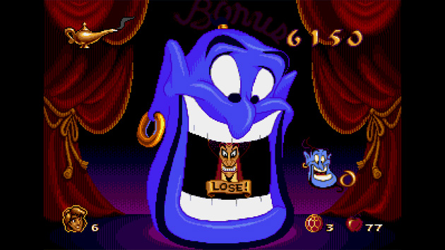 As well as the Abu bonus stages, there are also Genie bonus segments, which play out like a casino machine – different items flash up in front of the screen and depending on when you press the button, you will ‘win’ whatever item stops. But I don’t know if I’m just terrible – but about 90% I just land on Jafar and that means you instantly lose all your goes for the bonus stage.