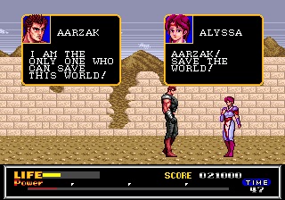 Yes, indeedy. When it was released in Japan, the game was titled Shin Seikimatsu Kyūseishu Densetsu Hakuto No Ken (新世紀末救世主伝説 北斗の拳), which was a direct sequel to the SEGA Mark III title, Hakuto No Ken (北斗の拳), which was released on the Master System as Black Belt in the US. Since SEGA completely altered the identities and plots in both games when they came stateside, there is no connection between Black Belt and Last Battle with regard to their storyline. In Last Battle, you play as Aarzak, a hero who is of course off to save the world by punching stuff. That’s all you really need to know, anyway.