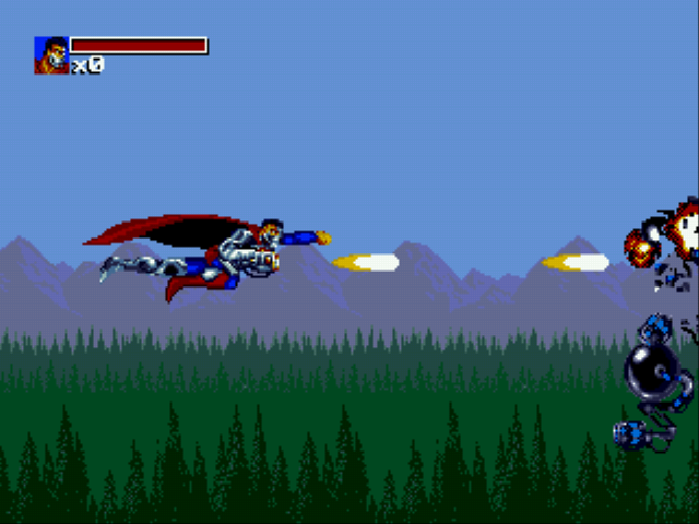 The designers at Blizzard did add a few touches to their stage designs which mixed things up. Superman will occasionally be forced to fly to scale buildings or fight airborne foes, and there are some side-scrolling shooter stages, too, though your character’s large sprite size can make it difficult to maneuver adequately, which is particularly noticeable in Steel’s flying stage.