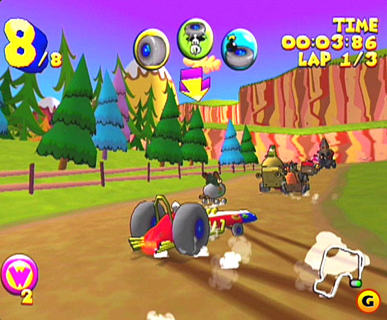 According to the game manual, each character/vehicle has differing stats, though they really aren’t evident when you are racing, because the AI cheats so damn much.