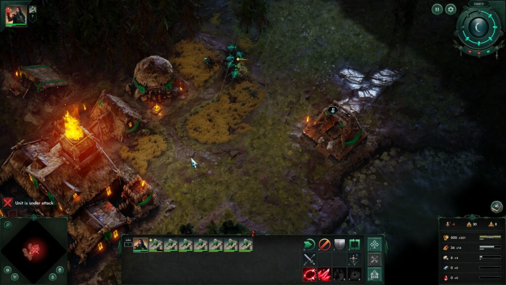 Another interesting thing to note is the day/night cycle. Time passes as you play, and when the sun goes down, the enemies and nightmares become stronger. Units also can gain more experience by defeating enemies at night but run risk of dying faster. It should also be noted that every three days, a deadly surge of enemies will appear. Shoring your defenses in the early game is very important to prevent being wiped out. Should your base take damage, you will be able to repair it when the dawn comes.