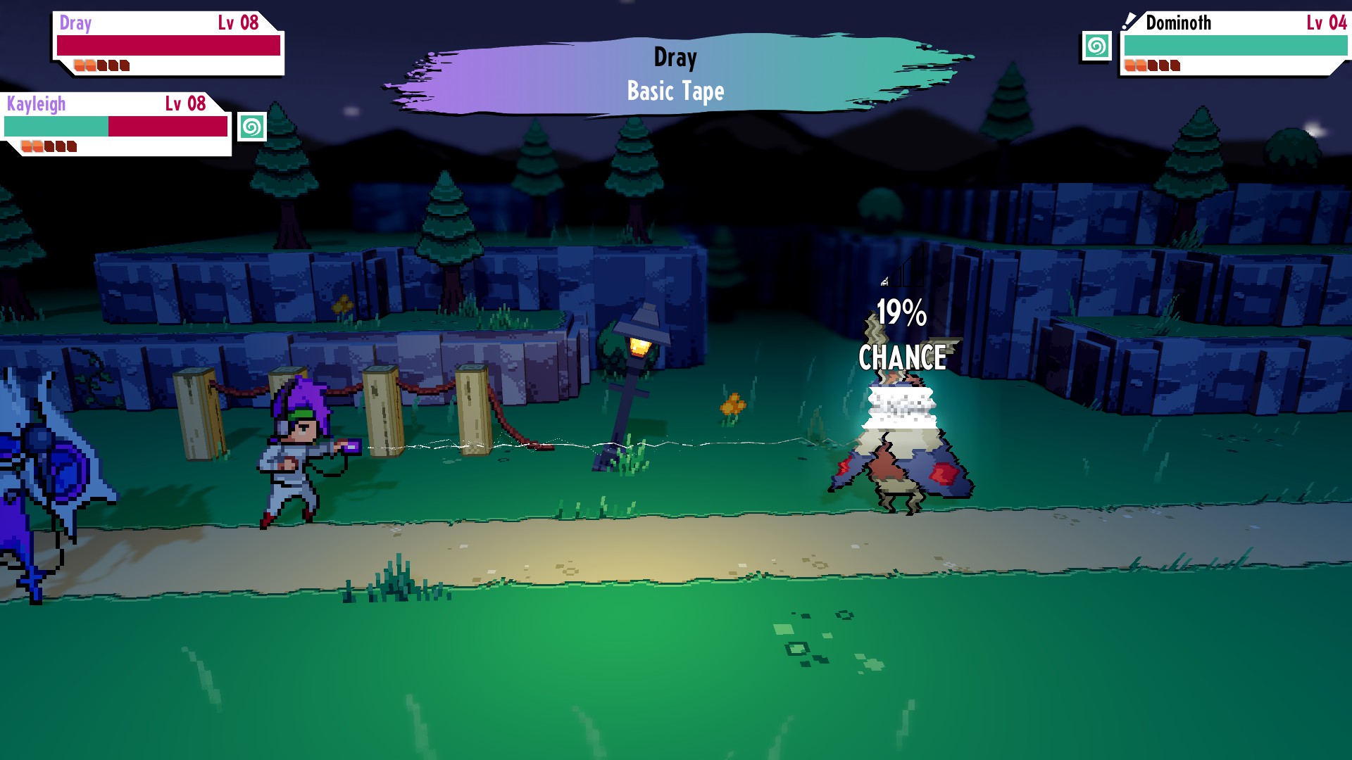Combat is turn-based, with you and any partners you have taking the form of monsters you’ve collected. Each partner has a signature tape they start with, but you can swap this out mid-battle if you wish. Battles play out as you’d expect: if a beast is knocked out, you switch to a different one and keep on going. A touch that honestly is super cool to me is that saving your game and healing is you hanging out with your partner, either at a cafe or camping in the wilderness.