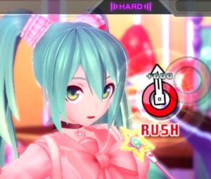 There are two new gameplay mechanics introduced in Project Diva X. The first is “Rush” notes. Triggering a Rush note will have you smashing the corresponding button as many times as you can before the timer runs out to build more points. I hate it.
