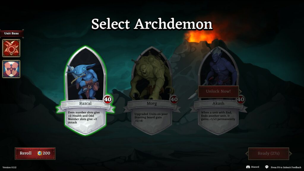 First and foremost, Hellfire Tactics is a competitive online auto battler. You pick of random Archdemons, which gives you a passive ability throughout the match. You are part of a group of 8 that will take turns summoning creatures and swinging at each other in an attempt to bring down their life total to zero. On the surface, this seems pretty easy to grasp until you realize nothing is explained to you at all.