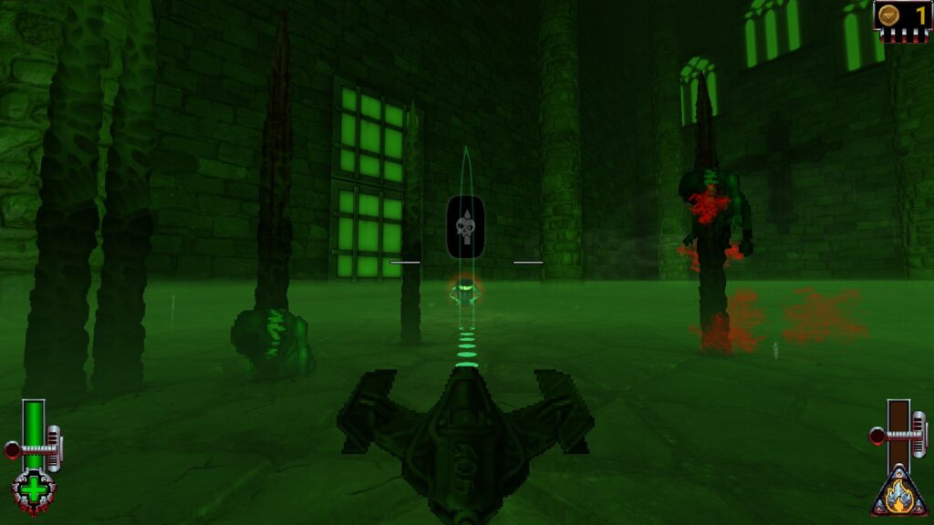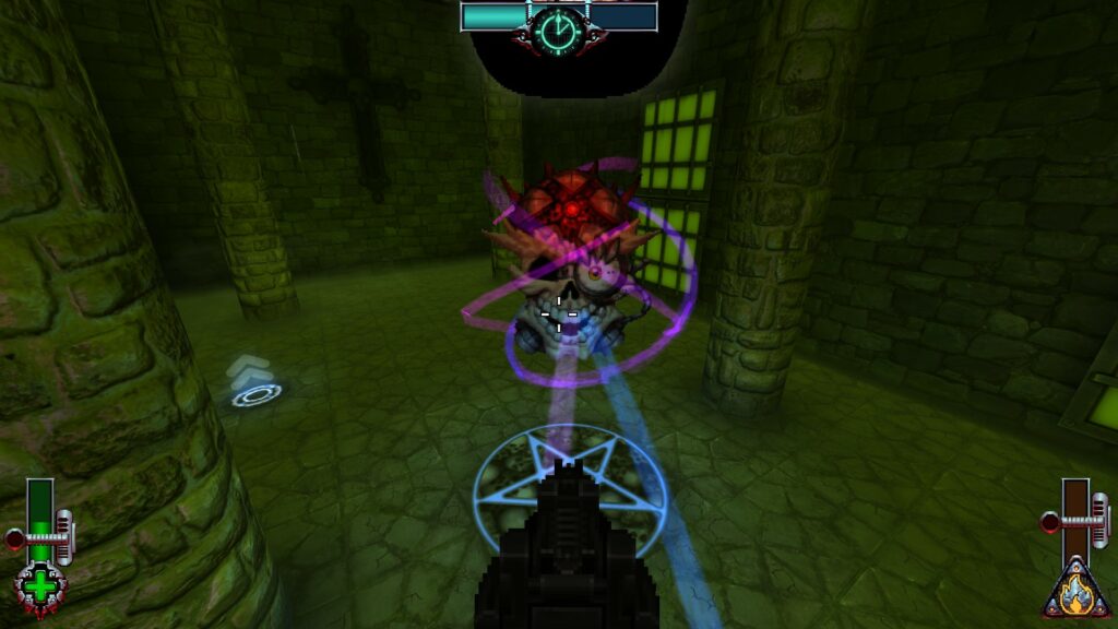 The level design in Impaler is singular: a rectangle room with the spawn point in the center. Every time you begin a round, enemies can show up anywhere in the room. So, it pays to keep your head on a swivel. Enemies are varied as well and not locked to any particular wave. Vampires, slimes, floating heads with laser eyes can appear in differing levels of health and damage. There are also pillars that can appear, blocking you off or providing cover depending on how you look at it. They are breakable. However, you may not always want to.
