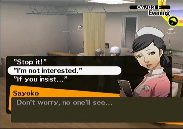 One of the jobs is as janitor at a hospital. One of the optional social links called “Devil” can be found here, as well. To increase this social link, you have to consent to being groped and sexually harassed by a woman who is more than 10 years older than your character who’s supposed to be a 14-year-old high school freshman.
