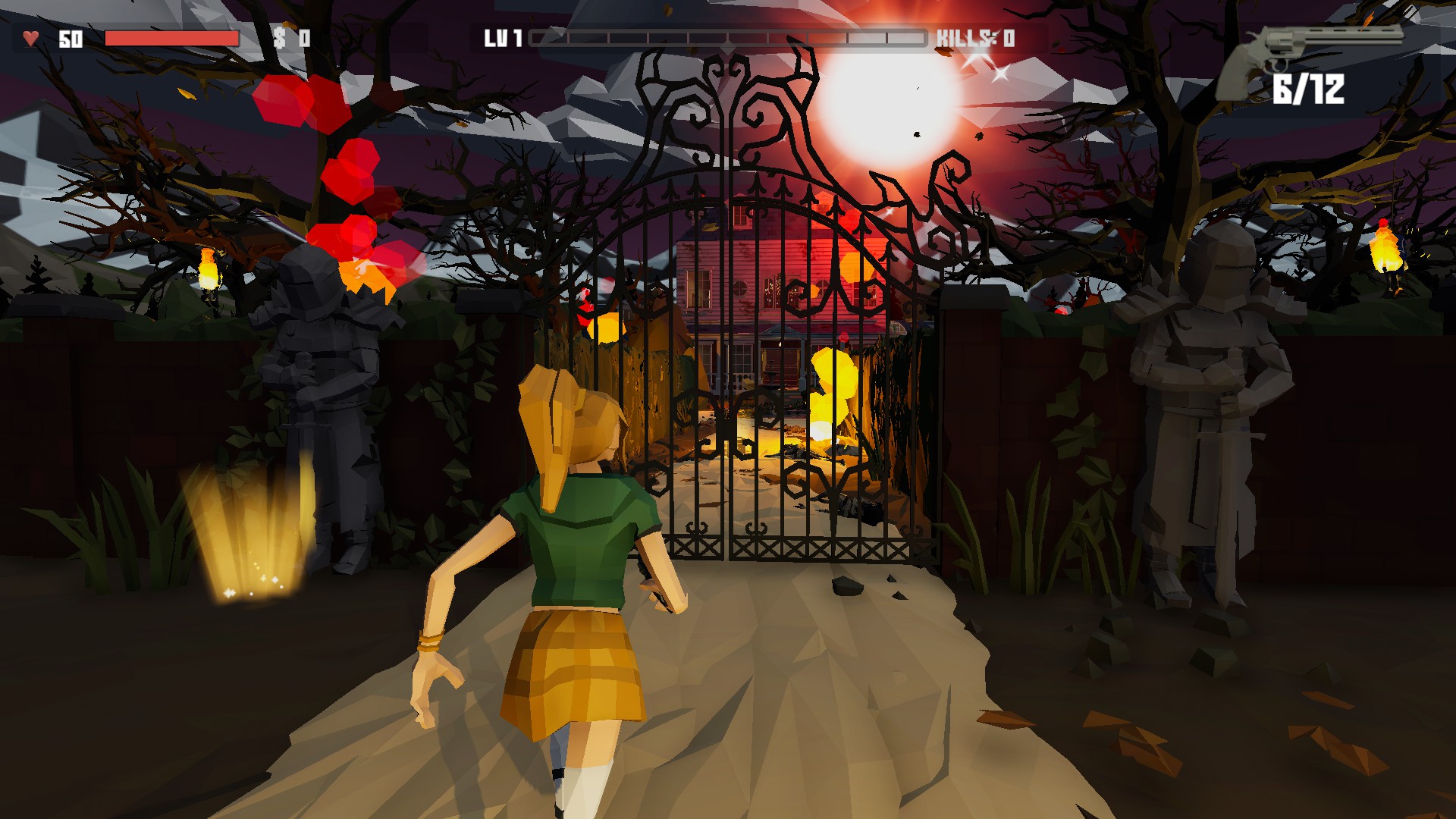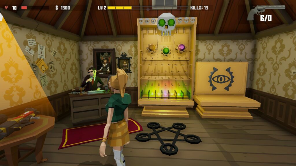 Weaponry is your only hope of survival in Secrets of the Witch House. However, you are on the strictest of budgets when it comes to ammunition. You start with a revolver that has 18 shots. You have to survive on those until you get another gun to swap to. Given the number of enemies you will have to face, this is not going to be easy. You also do not have ammo drops; you have to find new weapons to replace the old ones. And Lord help you if you get an explosive type of weapon, because that will kill you more often than the enemies will. Shoot the enemy and if they are too close, you die in the explosion. Shoot the floor or wall by accident, say goodbye to your run.