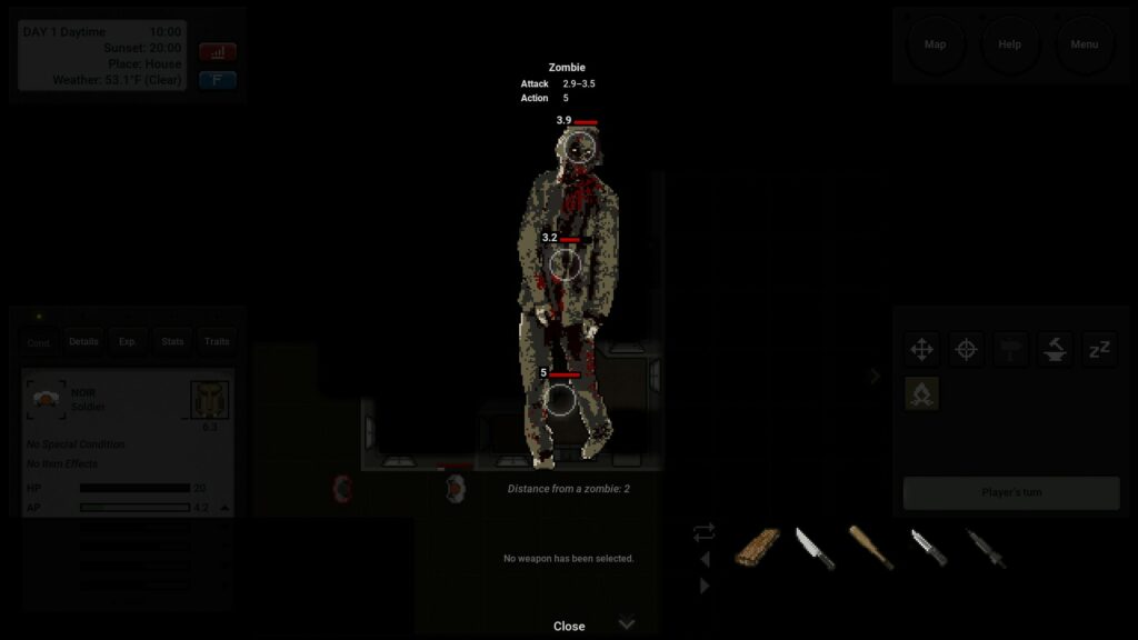 The biggest part of Terminus: Zombie Survivors is its action system. You have a set amount of Action Points that allow you to move and do various tasks. These can range from looting a location for materials and weapons to attacking zombies or reinforcing barricades. Everything in the game requires AP to do. The only time you don’t use AP is when you are sleeping, which can regenerate your other stats to a point. I say to a point because no matter what you do, something is always going down. Be it your health, sanitation, body warmth, or moral.