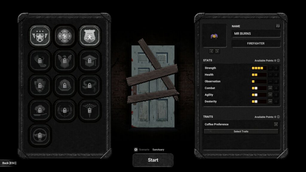 Let’s start off talking about you as the player. When you start up a run of Terminus: Zombie Survivors, you can pick a ‘job’. This will give you a preselected load-out of traits, which will determine your surviving experience. You are allotted a few extra points to put into your stats, as well as picking a trait to help boost your character ahead to give them a fighting chance. More character archetypes can be unlocked through successfully surviving and making it to Terminus.