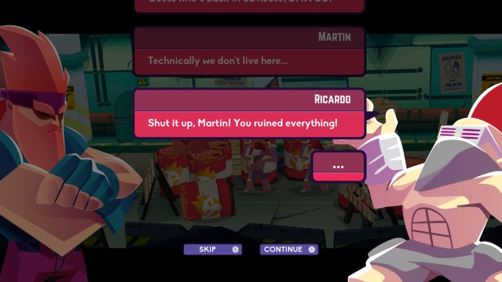 Not to be overlooked is the cutscene during critical moments in the game. We are gifted with beautiful animation and witty dialogue. I found myself laughing on several occasions by the “bros” or the “Boss” Legit, an influencer who just wants to make good salsa. Dude, I totally sympathize. Pass me the chips and let’s talk! Deciding that violence isn’t always the answer, Alpha and T. Juan show that they really are the good boys here.