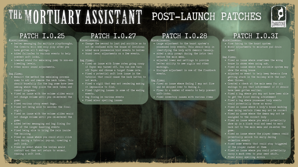 Clarke has tirelessly worked to make The Mortuary Assistant run smoother, taken DMs, Discord threads and Steam reviews and improved it. It is because of this, I have gone back in after each patch, and still came away spooked to my core. The horror community has responded positively to his hard work. And he has plans to continue updating the game with new bodies, fresh haunts, and modes, including an embalming only, and story event free mode.