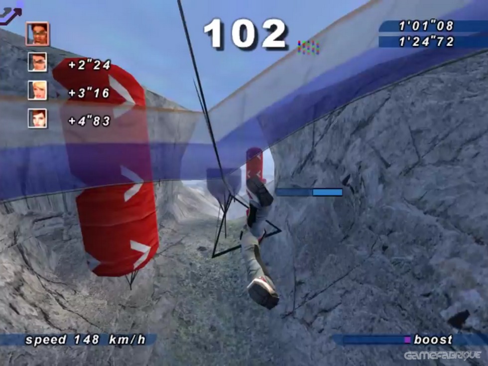 Speed gliding sees players towed behind a plane while gripping a hang-glider. Here, speed is gained by successfully weaving through balloon slaloms. It’s a bit unpredictable, and turbo-boost is still available for use even though it has no effect, but the track lines are easiest to follow here as the path is dictated by the pull of the plane. Dismounting from a speed glide requires players time their detachment and safely land within a target area. Glide too far or fall too short and it’s game over.