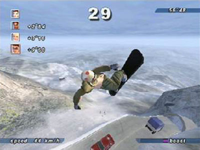 In any given Xtreme Sports course players may be mountain biking, snowboarding, speed-gliding, bungee jumping, parachuting, or quadding. There are no manual transmissions or vehicle specs to tweak. It’s just accelerate, brake, jump (depending on the vehicle), and turbo boost (a finite bar refilled by doing tricks or punching other people, like in real life).