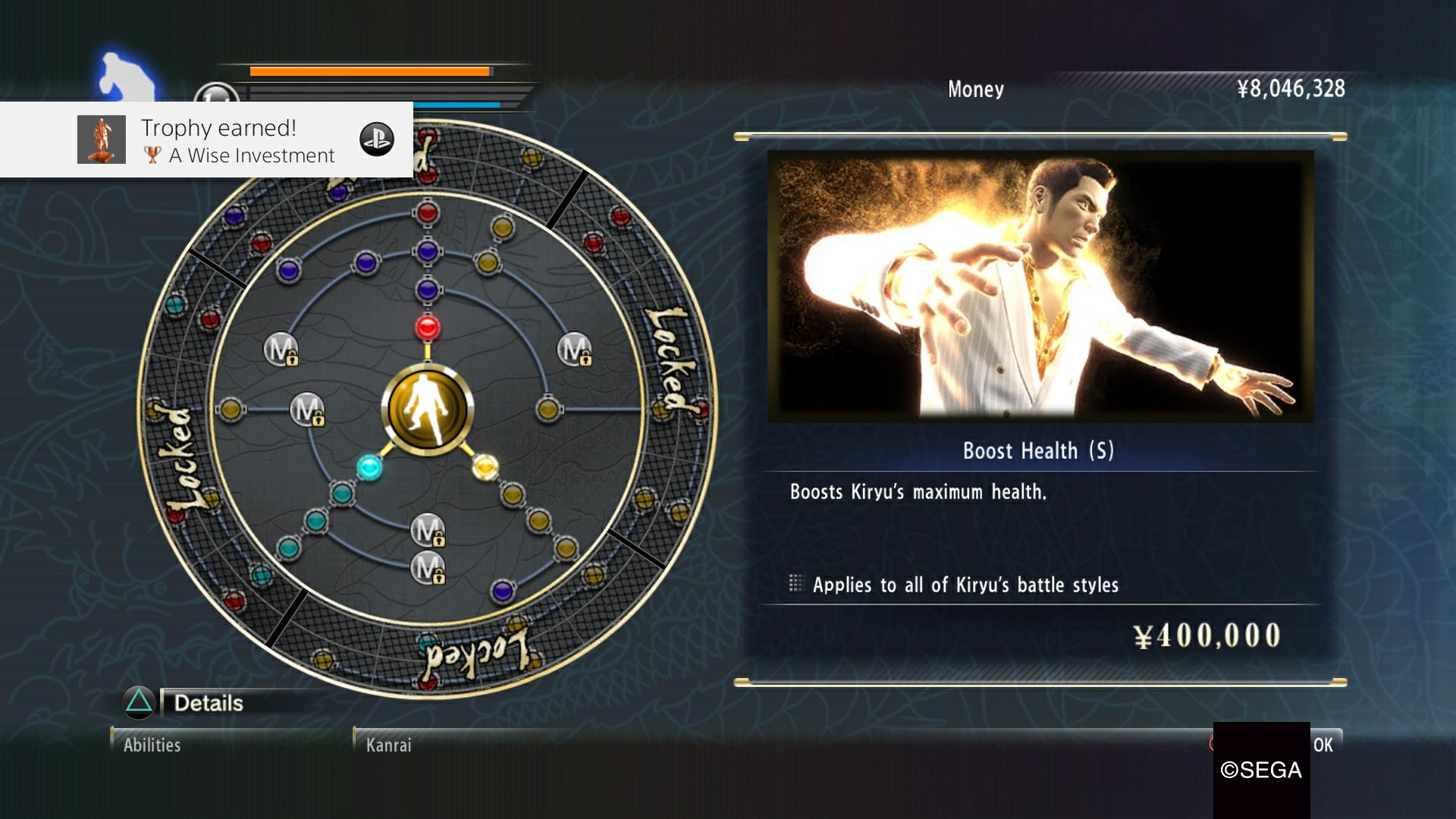 But back to the combat. At various points throughout the game, you’ll play as Kiryu and Majima, who each have their own unique fighting styles. You start each character with one, but pick up the other two in fairly short order, and while you can build up the skills of each independently through an upgrade tree of sorts (done by investing the money you earn in various ways, including beating on thugs to see the yen come flying out), finding one that’s right for you should be a simple matter.