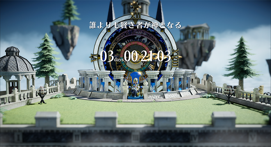 The teaser site shows some sort of floating isle, with a time/clock motif going on. In the centre is a huge clock face, counting down to the launch of the site, with a digital countdown on display.