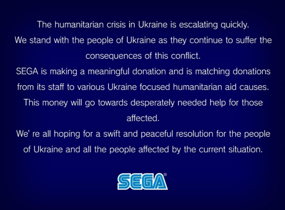“We stand with the people of Ukraine as they continue to suffer the consequences of this conflict,” it said. “SEGA is making a meaningful donation and is matching donations from its staff to various Ukraine focused humanitarian aid causes. This money will go towards desperately needed help for those affected.”