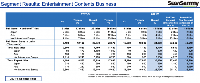 Overall a mixed bag when it comes to their sales report; Arcades and pachinko slots have undoubtedly taken a hit because of the pandemic, so it’s only natural their sales would fall in that division. Those video game sales definitely show where their bread is buttered.