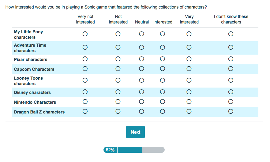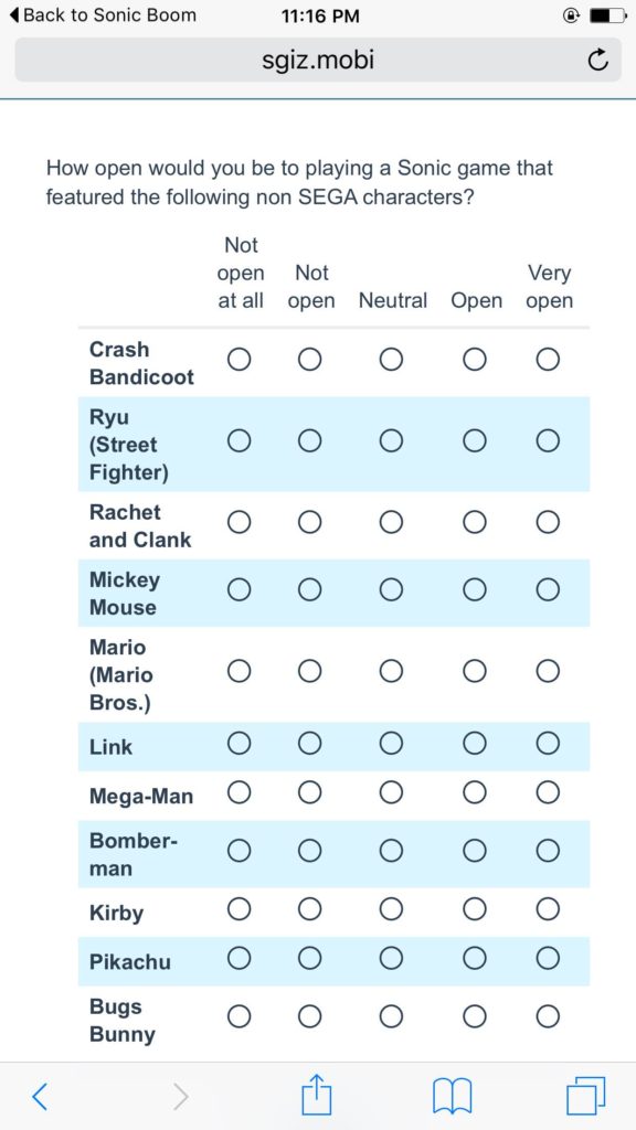 The survey then got a bit more specific, asking fans how open they would be to having non SEGA characters in a Sonic game. The list included such characters as Crash Bandicoot, Ryu, Ratchet and Clank, Mickey Mouse, Link, Pikachu, and Mega Man. You can check out the entire survey in the gallery below. Thanks to Elizabeth Silvas for the screenshots!