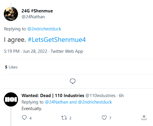110 Industries responded to a tweet asking about Shenmue 4, but the answer unfortunately got deleted since. Though the Tweet no longer exists on Twitter, the handy Wayback Machine managed to snag a screenshot of it. In response to a user saying #LetsGetShenmue4, 110 Industries replied “Eventually.” With the deletion of the comment, we wonder if they were supposed to say anything at all.
