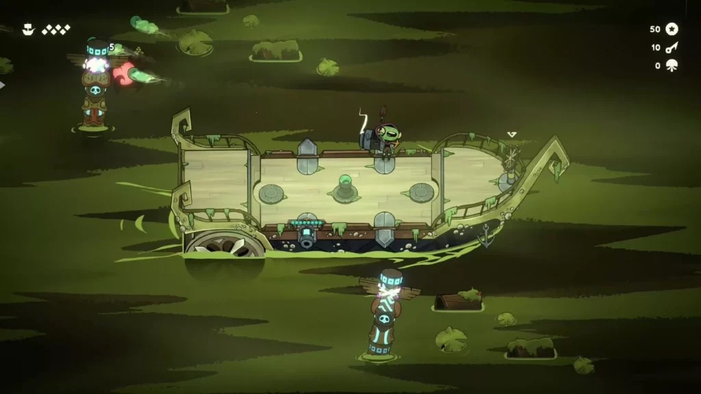The heart of the game is you tasked with defending your ship from creatures. You do this by attacking with your characters paddle melee attack or by using the cannons placed on the sides of the ship. Also, you must refill the ammo on the cannons manually. Each type of ammo is located on pedestals on the deck of your ship. There are a limited number of pedestal, so choosing positioning and ammo type is vital.