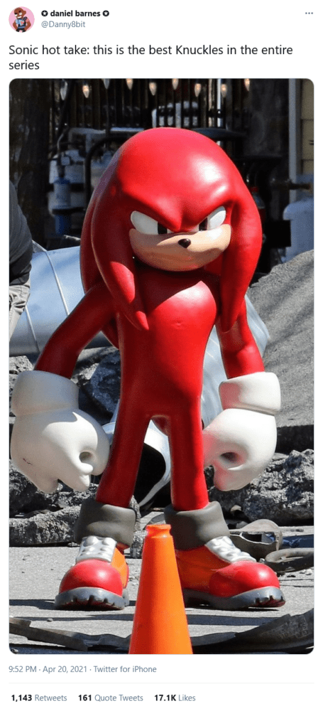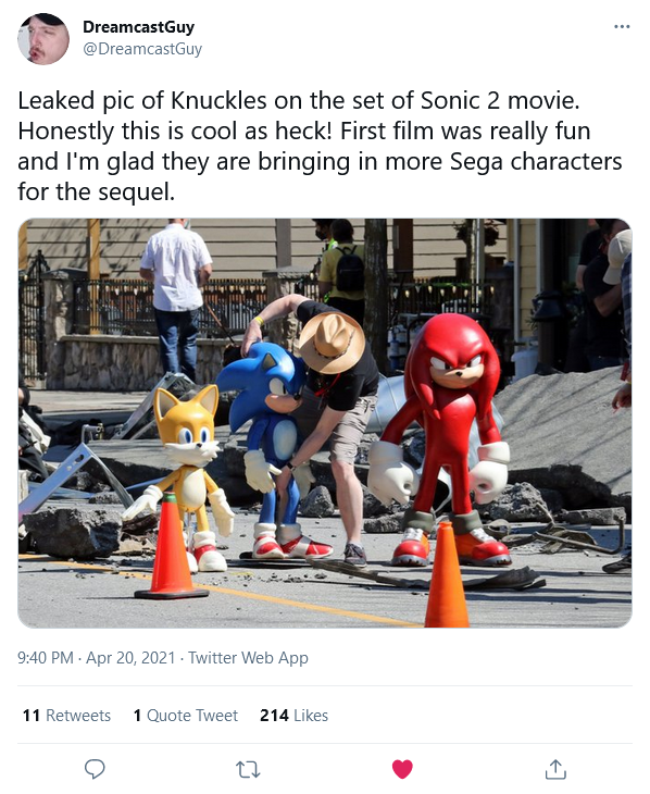 When you’re filming on location, it can be difficult to keep certain aspects of your film a secret. Fortunately for Jeff Fowler and the folks at Paramount working on the Sonic the Hedgehog 2 movie in Fort Langley, BC, the biggest surprise to escape their set and explode across Twitter is also one of the most obvious.