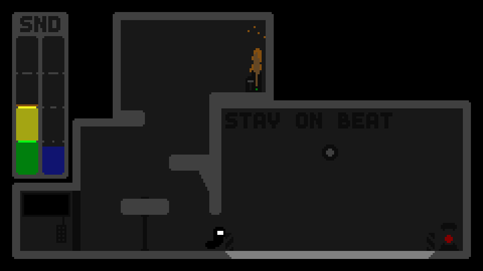 Compounding the difficulty are strategically placed lasers that will fry you to death if you make a noise louder than that of the music. There’s a meter that tracks the music’s volume and your own, so you can better time your path through each stage.