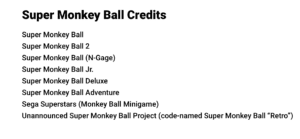 In his credits for SMB, he put an unannounced project under the title “Super Monkey Ball: Retro”. Of course, the site doesn’t go into anymore detail, but one can assume that SEGA is making an anniversary game for SMB.