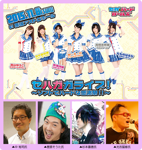 SEGA Japan has announced today Yuji Naka (Sonic series co-creator, Phantasy Star series creator), Takenobu Mitsuyoshi (SEGA Sound Unit [H.] vocalist and SEGA Sound artist) , Sugawara Sota (Hi ☆ sCoool! SeHa Girls anime director), and Sugimoto Yoshinori (Hi ☆ sCoool! SeHa Girls music composer) will join as guests for a SEGA Hard Girls kickoff tour concert to be performed on November 8th, 2015 at the Harajuku Astro Hall in Tokyo Japan.